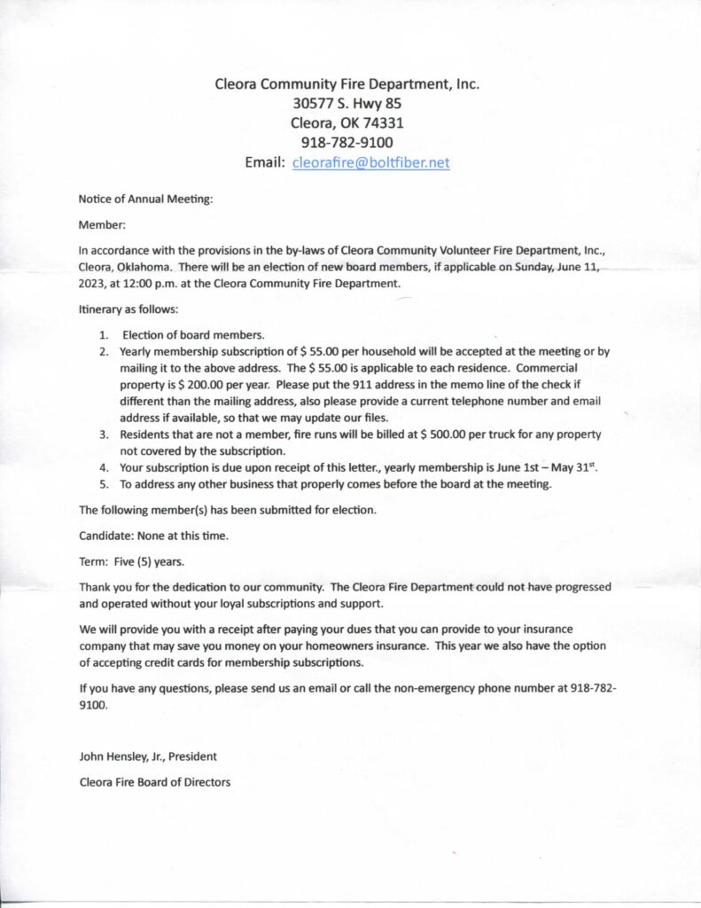 Cleora Fire Department Dues. It’s time to renew your Cleora Community Fire Department subscription. See notice and instructions below: By wspoaAdmin|2023-06-06T12:14:55-05:00June 6, 2023|AroundTheShores|0 Comments Share This Story, Choose Your Platform! FacebookXRedditLinkedInWhatsAppTumblrPinterestVkXingEmail Related Posts Leave A Comment Cancel replyComment Save my name, email, and website in this browser for the next time I comment. Δ