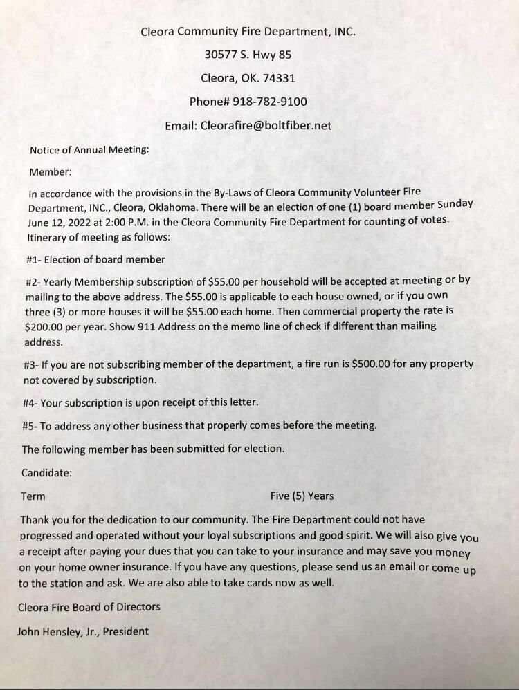Our fire dues have changed this year. They will be due June 16,2022 and your subscription covers all the way to June 15, 2023. These dues help us keep our trucks in working shape and put fuel in them also the dues helps us buy new equipment for our firefighters and the community that we care so much about. Thank you from the Cleora community Fire Department.